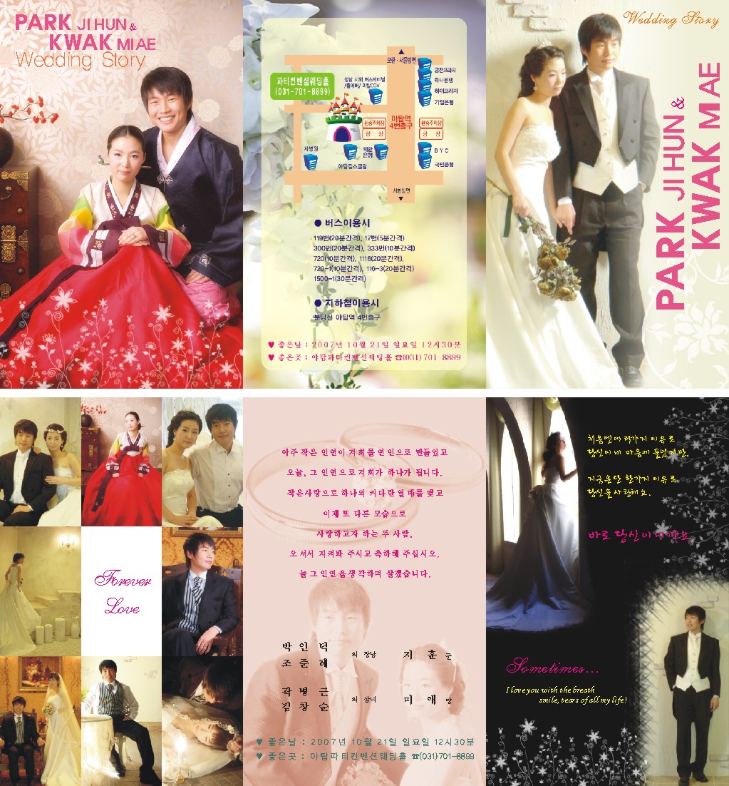조언들 감사합니다.^^ 어르신분들께는 다른 청접창을 보냈고요 이거는 친구들에게 e-mail 보낸다고 만들어달래서 그냥 사진만 많이 집어넣었어요.ㅋ 어제 결혼식은 성공리에 잘치뤘답니다.ㅋ 저의 축가와함께.ㅋ