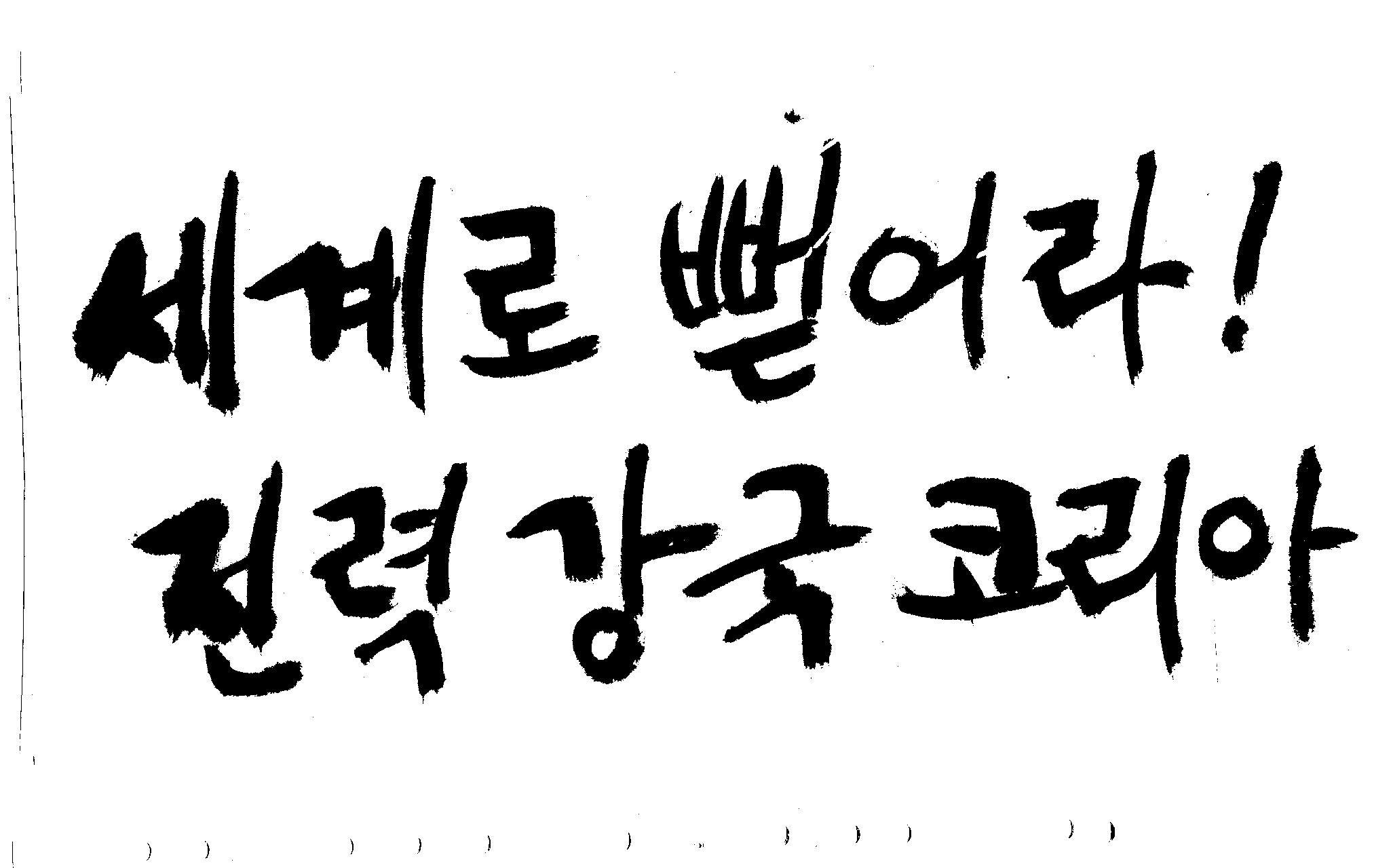캘리 좀 부탁드려요!~ 김철호 일반 1 10793 2008.12.24 12:09 > > > > > 전력회사 신문광고를 하는데요 캘리로 멋지게 하고픈데 > > 캘리프로그램으로 아무리 써도 느낌이 안나옵니다 ㅜ.ㅜ > > 이런걸 부탁한다는 자체가 너무나도 염치없지만 부탁드립니다. > > > > 세계로 뻗어라! 전력강국 코리아 > > > 보기는 쉬워도 하기는 어려운게 > 세상 모든 일 일겁니다. > 그중에 캘리그라피가 그런것 일 겁니다... > 스캔중에 글꼴이 잘린것은 서로다른글꼴서 편집하시길... > 글수가 많아서 어쩔 수없네요... >